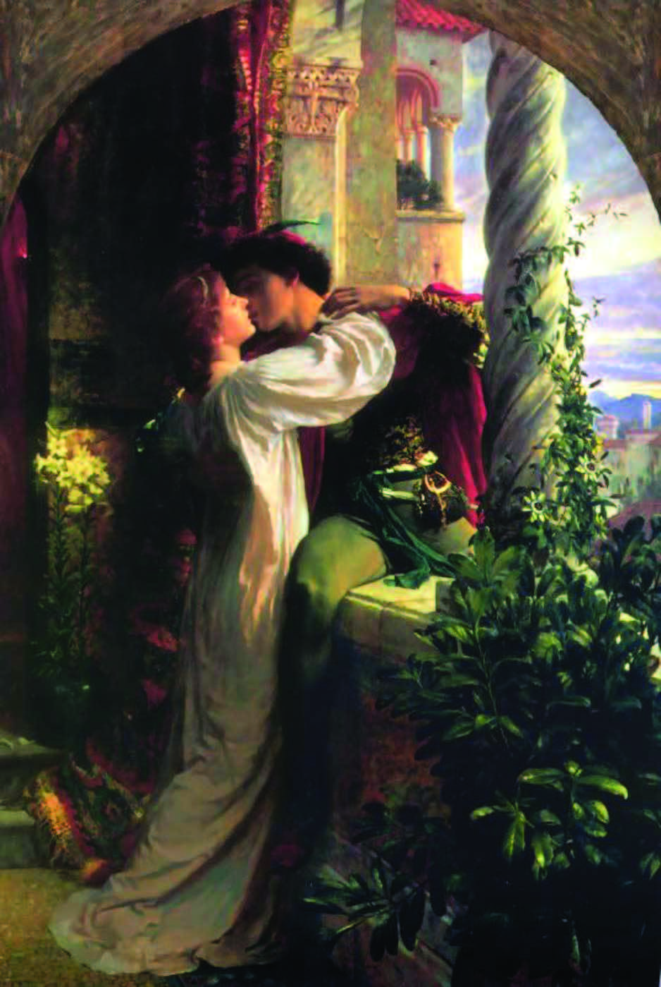 베로나의 명문 몬태규 집안과 캐풀렛 집안은 오랜 원수지간이다. 그러나 운명의 장난으로 몬태규 집안의 아들 로미오와 캐풀렛 집안의 딸 줄리엣은 첫눈에 사랑에 빠진다. 이들은 로렌스 신부의 주선으로 비밀리에 결혼식을 올린다. 그러나 식을 마치고 돌아오는 도중에 로미오는 줄리엣의 사촌인 티볼트가 싸움을 걸어오자 그를 찔러 죽이고 만다. 로미오는 추방선고를 받게 되어 단 하룻밤만을 줄리엣의 방에서 지새우고 떠난다. 프랭크 딕시의 <로미오와 줄리엣>은 로미오가 떠나기 전, 신혼 첫날밤을 보낸 두 연인이 안타까운 이별의 입맞춤을 나누는 장면이다. 두 눈을 지그시 감은 채 조금은 불안정한 자세로 키스를 나누는 어린 연인의 모습은 너무나도 애틋하다. 앳되고 순수해 보이는 로미오와 줄리엣의 묘사에서 그들의 지고지순한 사랑을 엿볼 수 있다. 배경의 아치형 구도나 건물의 양식, 고대 로마식으로 장식된 대리석 기둥 등에는 화가의 취향이 담겨있고 초목의 생생한 묘사에서는 자연주의적 세부묘사가 돋보인다. 그녀는 로미오가 추방 당한 뒤 다른 남자와 결혼하길 강요당하지만, 순결을 지키기 위해 일시적으로 숨이 멎는 약까지 마신다. 그런데 놀랍게도 그녀의 나이는 당시 14세였다고 한다. 어두운 달밤과 위태로운 자세가 이들의 불운한 운명을 예고하고 있는 것일지는 모르겠으나 비록 비극적인 결말을 낳았다 하더라도 이들의 사랑은 수많은 사람의 가슴 속에서 아름답게 빛나고 있다.