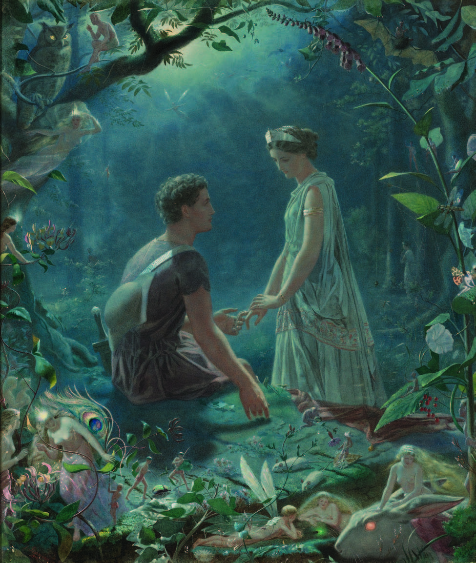 허미아와 라이샌더는 사랑하는 사이다. 그러나 허미아에게는 아버지가 짝지어 준 드미트리우스가 있다. 허미아는 진실한 사랑을 이루기 위해 라이샌더와 숲으로 사랑의 도피를 한다. 드미트리우스가 그 뒤를 쫓고 드미트리우스를 사랑하는 헬레나가 다시 뒤를 쫓는다. 이를 지켜보던 숲의 왕 오베론은 네 명의 사랑을 이루어주려고 하지만, 시종 퍼크의 실수로 허미아의 연인인 라이샌더가 묘약의 마법에 걸려 헬레나를 사랑하게 되고, 허미아를 추격해 온 드미트리우스까지 옛 연인 헬레나를 사랑하게 된다. 얽히고설킨 사랑의 화살표 속에서 한바탕 숲속에서 소동이 벌어진다. 오베론 왕은 시종 퍼크에게 다시 관계를 정리해 주라고 명하고 마침내 허미아와 라이샌더는 다시 사랑을 확인하고 드미트리우스는 헬레나를 선택한다. 모든 소동이 한여름 밤의 꿈처럼 지나가고 커플들은 결혼식을 치르며 퍼레이드와 무도회를 벌인다. 그 밤에 사랑이 춤추고 요정들도 춤춘다. 밤의 공기마저 사랑의 열기에 흔들린다. 존 시몬스의 <허미아와 라이샌더>는 한 여름밤에 숲에서 사랑을 속삭이는 주인공을 그린 그림이다. 한여름 밤이란 낮이 가장 긴 하지 무렵의 성요한제 전야라고 한다. 영국 사람들에게는 이날 밤에 기이한 일들이 일어난다는 미신이 있다. 그래서 그리스 신화와 성 요한제 전야의 미신을 결합해 환상적이고 동화 같은 러브스토리를 창작해낸 것이다.