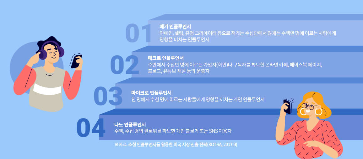 인플루언서는 소위 타인에게 영향력을 끼치는 사람을 뜻한다. 과거에는 예술 분야의 유명 작가, 연예인 등을 인플루언서로 여겼지만 최근에는 소셜미디어, 블로그, 온라인 커뮤니티 등의 활동이 일상화되면서 누구나 인플루언서의 반열에 오를 수 있게 됐다. 대중에게 미치는 영향력에 따라 인플루언서의 유형도 구분된다. 수십만~수백만 명에 이르는 사람에게 영향을 미치는 인플루언서를 메가 인플루언서, 수만~수십만 명에 이르는 팔로워를 확보한 사람들을 매크로 인플루언서, 1000명~수천 명에 이르는 사람에게 영향을 끼치는 사람들은 마이크로 인플루언서라고 부른다. 국내 메가 인플루언서로는 키즈 크리에이터 헤이지니, 게임 크리에이터 대도서관, 뷰티 유튜버 씬님, 이사배 등을 예로 들 수 있다. 해당 분야에서 워낙 영향력이 있다 보니 이들이 내는 입소문만으로 추가 구매가 이뤄지기도 했다. 이런 현상에 주목한 것은 광고업계다. 과거에는 메가 인플루언서의 영향력만이 크다고 여겼지만 현재는 마이크로 인플루언서를 영입하려는 움직임도 눈에 띈다.