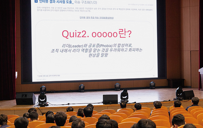 이어 그동안 진행되었던 기업문화 진단 결과를 공유하는 시간이 마련되었다. 조사 결과 서부발전 임직원들은 자신의 역할과 책임에는 높은 점수를 주었으나 공정한 인사 제도, 효율적인 업무 방식, 수평적 소통 부분에서는