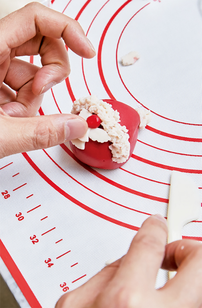 잘했죠?”라며 자랑스럽게 자신의 반죽을 들어 보인다. 본격적으로 산타 모양 화과자를 만들기가 시작되자 공방 안 분위기가 사뭇 진지해진다. 빨간 반죽을 얇게 펴서 초코 앙금을 넣어 동그란 모양을 만들고 모자를 씌운 뒤