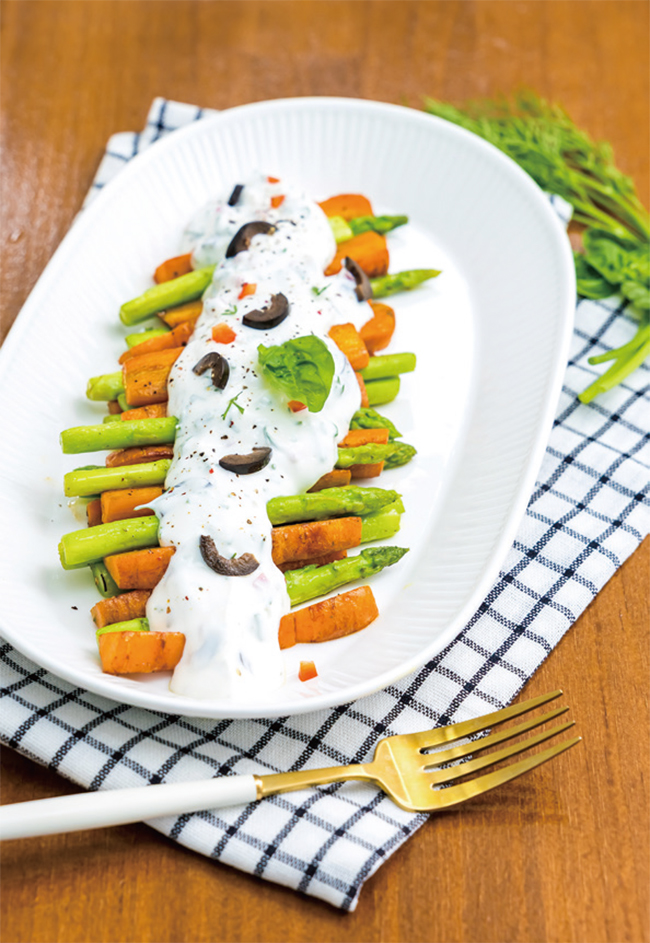올리브유를 두른 팬에 당근과 아스파라거스를 뚝뚝 썰어 넣고, 최소한의 소금과 후추로 간을 한 뒤, 그릭요거트에 허브인 딜과 유자청, 올리브를 섞어 만든 차지키 소스를 당근 위에 부드럽게 뿌려냈다. 채소의 아삭한