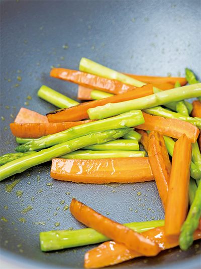 기름을 두르지 않은 프라이팬에 애호박, 가지, 당근, 브로콜리를 올려 노릇하게 구운 다음 꺼내기 전에 소금을 약간 뿌려 간을 한다. 연근은 끓는 물에 데친다.(또는 올리브유를 두르고 굽는다.-기름을 두르지 않은 채 구우면 연근은 딱딱해 진다.)