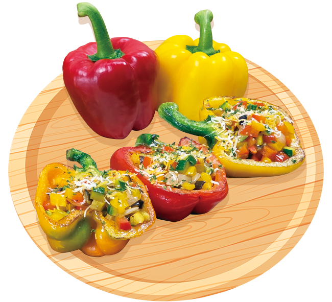 파프리카컵에 잡곡밥을 채우고 볶은 채소를 채워 담는다. 치즈와 파슬리가루를 뿌려 완성한다.