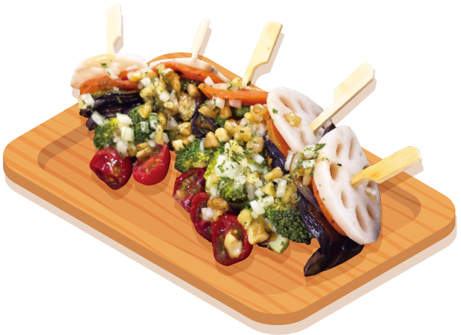 구운 채소와 토마토를 나무꼬치에 꽂고 드레싱을 뿌려 완성한다.