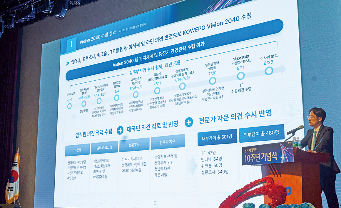 이날 서부발전이 앞으로 펼쳐갈 또 하나의 여정, 비전 2040 설명회 시간도 마련됐다. 지금까지의 10년이 함께한 시간이었다면 앞으로의 시간과 그 너머는 함께 만들어갈 미래다. 이 비전을 발표하고 공유한다는 건