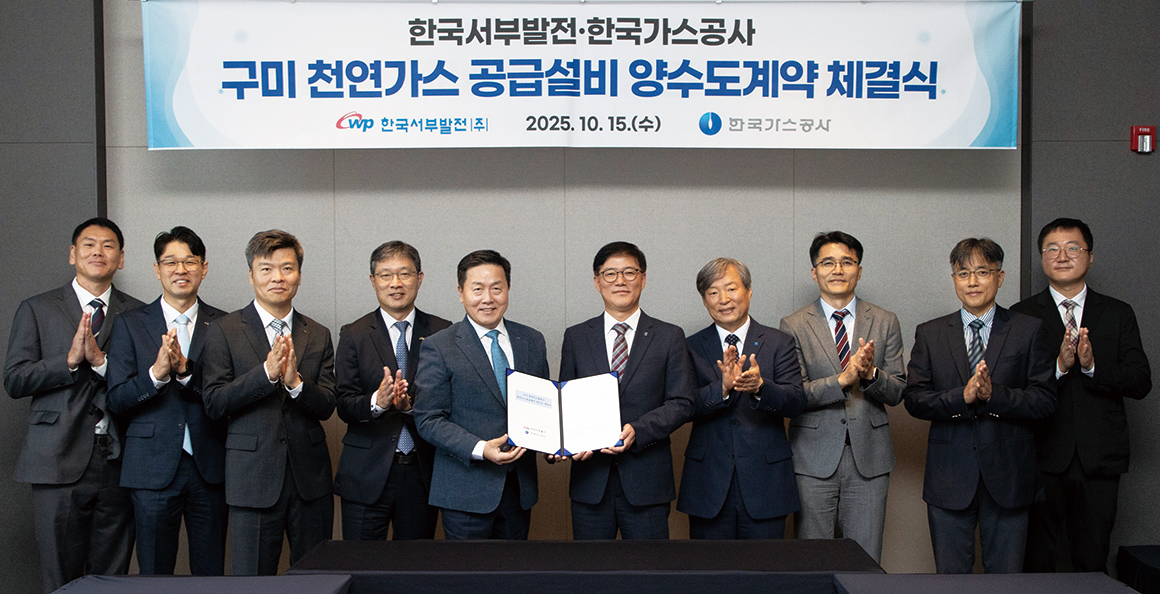 한국서부발전은 10월 15일 대전 오노마호텔에서 가스공사와 ‘구미 NG 공급설비 양수도 계약 서명식’을 진행했다. 행사에는 엄경일 서부발전 기술안전부사장과 김환용 가스공사 안전기술부사장 등 양사 관계자 10여 명이 참석했다. 서부발전은 중복투자를 예방함으로써 국가 예산 절감의 모범사례가 된 구미 천연가스(NG) 공급설비 공사를 성공적으로 마무리하고 운영 주체인 한국가스공사에 설비를 양도했다.